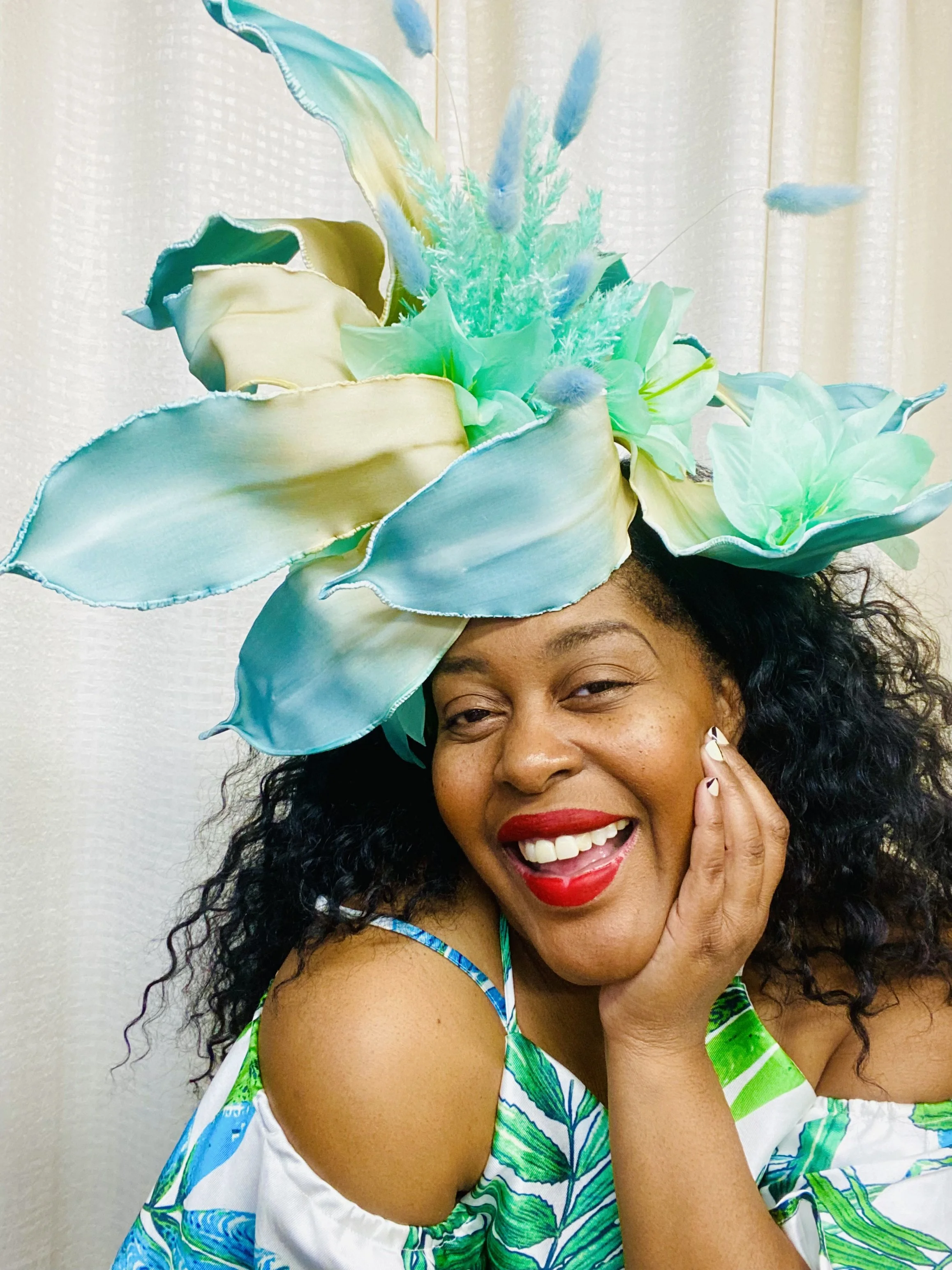 ISLAND VIBES is an energetic, fun-filled vacation in a one-of-a-kind headpiece! Hear the music? Feel the breeze. Live the joy. SOLD